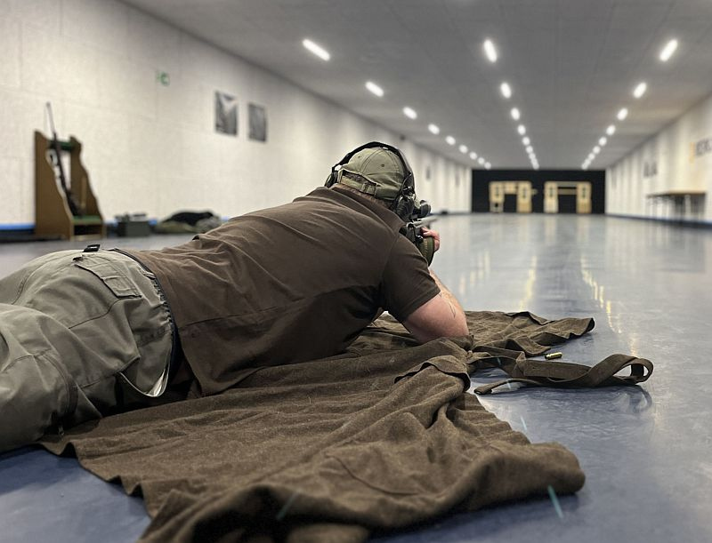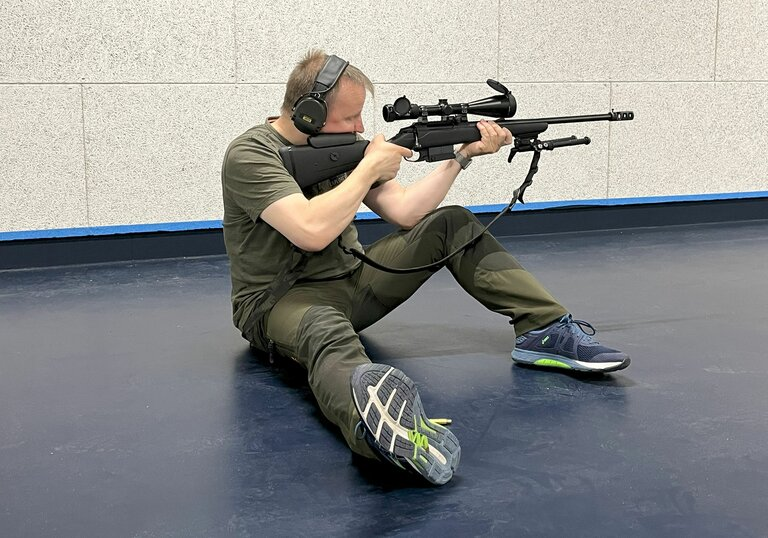 Klassischer Liegendanschlag: Beide Ellenbogen sind auf dem Boden abgestützt, der Körper liegt gerade hinter der Waffe.